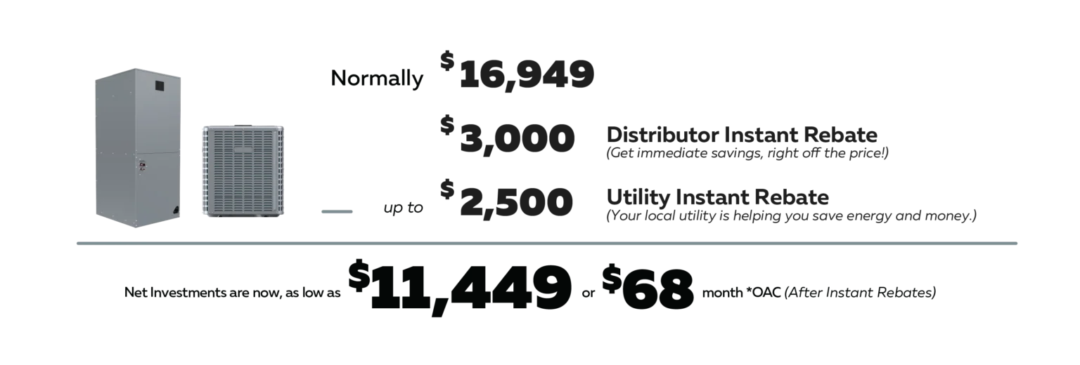 *Offers valid for residential customers only and Offers have no cash value and cannot be combined with any other offers. Offer as low as $11,449 based on heat pump system after distributor rebate and utility rebate are applied. Size of system determined by Villara’s Project Manager in-home calculation and comfort survey. Offer is good only when equipment is installed by Villara Building Systems. Residence must receive electricity from utility company and install qualifying equipment to be eligible for rebate. Net Monthly payment based on potential utility savings of $500 a year and on approved credit. *oac. Rebates are subject to availability of funds. Additional restrictions may apply.